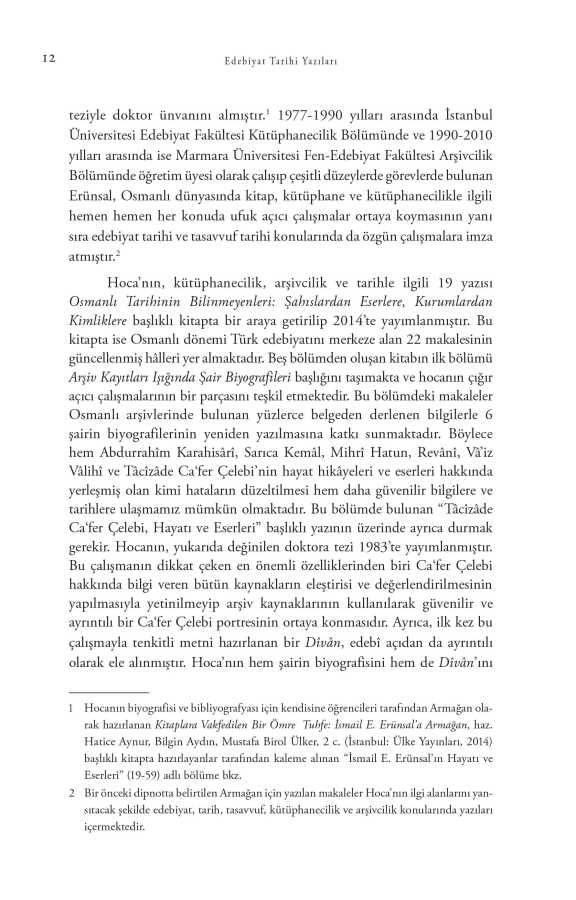 Bu eser, kitap ve kültür tarihi, arşivcilik ve kütüphanecilik alanlarında öncü ve ufuk açıcı çalışmalarıyla tanınan Prof. Dr. İsmail E. Erünsal’ın muhtelif zamanlarda yazdığı edebiyat üzerine makalelerinin gözden geçirilmiş hȃllerini bir araya getiriyor. Birinci elden sayısız arşiv kayıtlarının yanı sıra, ihmal edilen, bilinmeyen veya kaybolduğu düşünülen eserlerin incelenerek değerlendirildiği bu kitapta, Osmanlı dönemi Türk edebiyatının çok çeşitli yönleri okuyucuya sunulmaktadır. Özellikle ele alınan arşiv kayıtları, bizlere şairler ve bağlı oldukları edebî-kültürel ortam hakkında yepyeni fikirler öne sürme ve değerlendirmeler yapma imkânı vermektedir.
