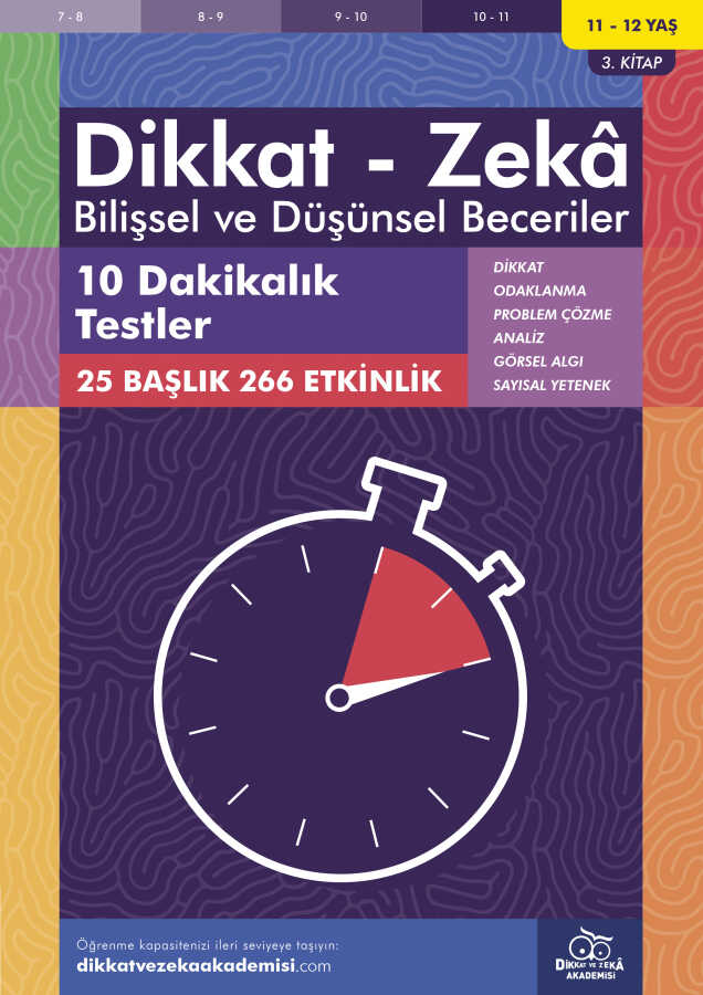 "10 Dakikalık Testler ile çocukların dikkat, görsel algı, odaklanma, problem çözme, planlama ve akıl yürütme becerilerinin düzeyi on dakika gibi kısa bir sürede belirlenir ve yetersiz olduğu becerilerinin geliştirilmesi için öğretmen ve ebeveynlere önerilerde bulunulur. Farklı olan şekli bulma, ardışık şekilleri tamamlama ve şeklin simetriğini bulma etkinlikleri ile çocukların geliştirilmesi gereken beceriler belirlenir, test kitapçığının sonunda bulunan Gelişim Tablosu ile çocuğun bilişsel gelişimi takip edilir. İlkokula başlayan çocukların bu çalışmaları Bilsem sınavlarına yardımcı olmak için hazırlanmıştır."