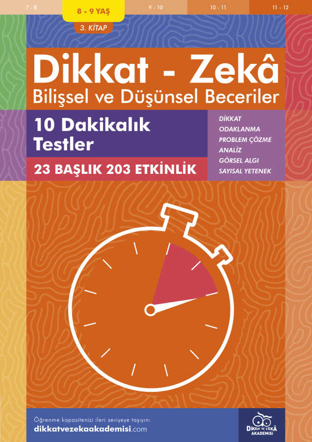 "10 Dakikalık Testler ile çocukların dikkat, görsel algı, odaklanma, problem çözme, planlama ve akıl yürütme becerilerinin düzeyi on dakika gibi kısa bir sürede belirlenir ve yetersiz olduğu becerilerinin geliştirilmesi için öğretmen ve ebeveynlere önerilerde bulunulur. Farklı olan şekli bulma, ardışık şekilleri tamamlama ve şeklin simetriğini bulma etkinlikleri ile çocukların geliştirilmesi gereken beceriler belirlenir, test kitapçığının sonunda bulunan Gelişim Tablosu ile çocuğun bilişsel gelişimi takip edilir. İlkokula başlayan çocukların bu çalışmaları Bilsem sınavlarına yardımcı olmak için hazırlanmıştır."