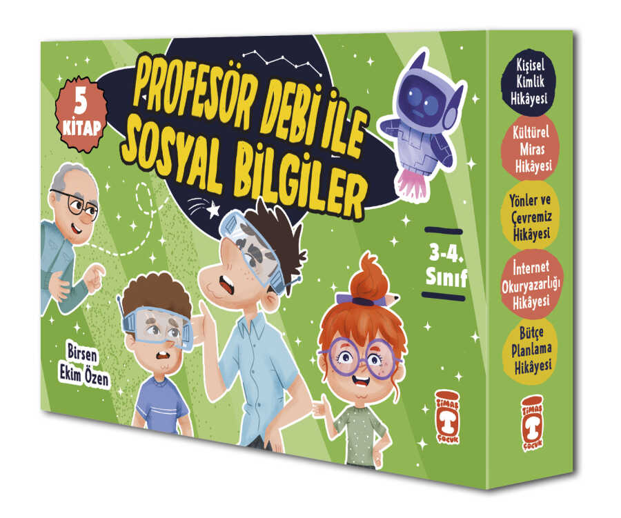 Profesör Debi ile Sosyal Bilgiler kitabında, söz konusu dersin ünitelerinin kazanımları çıkıyor karşımıza. Bu kazanımlar hikâyelere yedirildiği için okumanın doğal akışını bozmuyor ama sonunda taşıdıkları duyguyla kalıcı öğrenmeyi sağlıyor. Çocuklara yardım için dünyaya gönderilen uzmanımız Hayati ise gezegenimizi küçümsemesi, sakarlıkları ve yanlış anlamaları, çocukların okuma serüvenini renklendiriyor. Haydi, Sosyal Bilgiler konularını bir de evrenin en ukala, en beceriksiz uzmanı Hayati ile öğretmeyi deneyin. Yolunu kaybetmeden yönleri, parasızlık çekmeden bütçe hazırlamayı öğretemeyen Hayati ile keyifli dakikalar geçireceksiniz.
